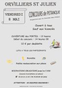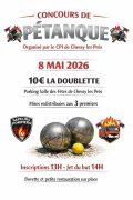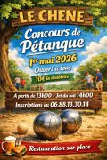 Bonjour le comité des fêtes de Le Chêne 10700 organise à la salle des fêtes un concours de pétanque le 1mai 2026 à partir de 13h00 jet du but 14h00 Inscriptions au 06.88.13.30.14 -