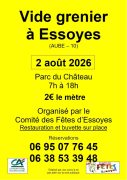 Organisé par Essoyes Comité des Fêtes Vide grenier d’Essoyes a lieu au Château et autour du terrain de foot. Une grande partie des exposants sont à l’ombre, bien sûr nos amis les animaux sont les bienvenus, des toilettes sont disponibles....