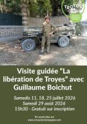 Avec Guillaume Boichut Venez marcher sur les traces de nos libérateurs lors de cette visite guidée inédite qui vous mènera sur les lieux emblématiques de la libération de Troyes contre l’occupant allemand qui s’est déroulée les 25 et 26 août... -